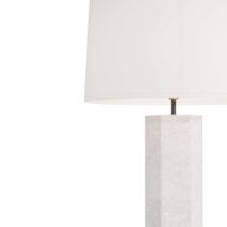 Elegant and architectural, the Vesanto lamp mixes effortlessly with any design style. The simple, hexagonal post is carved in ivory glass stone composite, which mimics the pebbled nature of natural stone. An English bronze steel base follows the lamp’s angular shape. The light is finished with a cylindrical finial in an English bronze finish and an off-white microfiber drum shade, lined in off-white cotton.