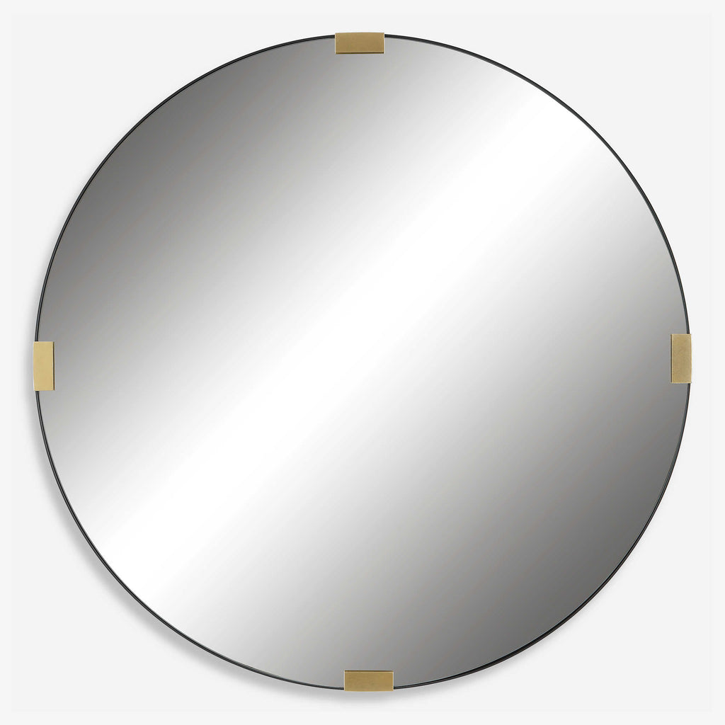 This round mirror's sleek design makes it the perfect modern accent. The iron band frame is finished in satin black and is accented by lightly antiqued gold leaf details.